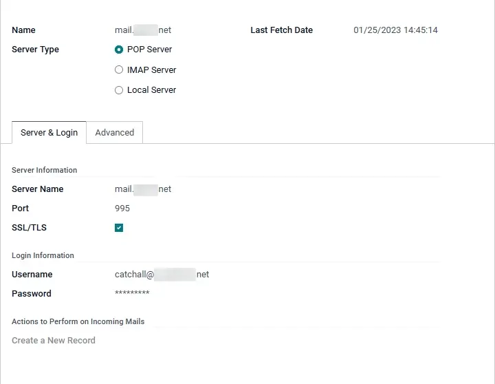 - Si el tipo de alojamiento de la base de datos es Odoo local, cree un servidor de correo entrante en Odoo para cada seudónimo. Puede crear un nuevo servidor de correo entrante en Ajustes ‣ Conversaciones ‣ Servidores de correo personalizados ‣ Servidores de correo entrante ‣ Nuevo. Complete el formulario según los ajustes del proveedor de correo electrónico. Deje el campo acciones a realizar en los correos entrantes en blanco. Una vez que complete toda la información, haga clic en PROBAR Y CONFIRMAR.