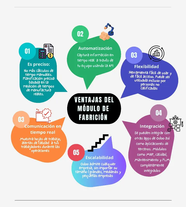 Gracias a la integración de todas las funcionalidades del Módulo de Fabricación de Odoo, se puede obtener una visión completa y en tiempo real de tu proceso productivo. Se puede monitorear el rendimiento de las máquinas, controlar los tiempos de producción, identificar cuellos de botella y realizar ajustes sobre la marcha para maximizar la eficiencia. Esto te ayuda a minimizar los tiempos de inactividad, mejorar la productividad y cumplir con los plazos de entrega de manera más efectiva.
