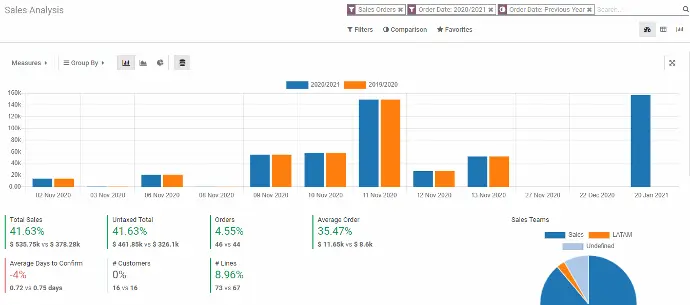 -Odoo Ventas le proporciona informes detallados de las ventas realizadas durante el periodo de tiempo que usted defina, con gráficos y una vista sencilla que permiten el fácil acceso al análisis de la información. Además, cada uno de estos reportes puede ser fácilmente descargado a su computadora en formato PDF y estar listo para impresión cuando lo necesite.