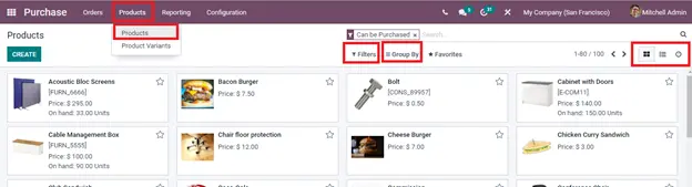 -El menú de Productos le permite cargar la información de los objetos a la venta, clasificarlos e integrarlos con Odoo Inventario, visibilizar el movimiento de ciertos productos en función de las compras, así como reabastecer su stock de manera automática.