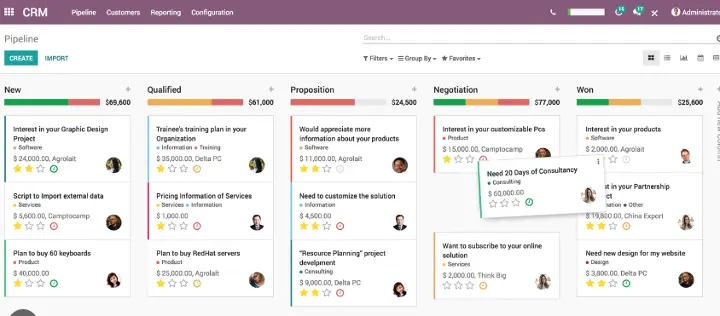 - CRM en Odoo: Odoo CRM es una parte integral de la plataforma y se integra de manera fluida con otros módulos como ventas, marketing y servicio al cliente. Permite a las empresas gestionar sus relaciones con los clientes, realizar un seguimiento de las oportunidades de venta, automatizar la gestión de ventas y ofrecer un mejor servicio al cliente.